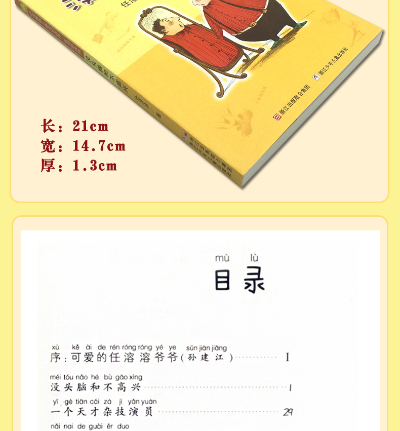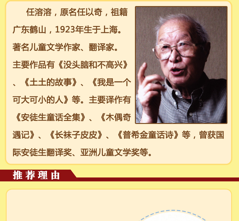 任爷爷可是鼎鼎有名的大作家,他写的书很多很 多,数都数不清,像大家熟悉的《没头脑和不高兴》 、《一个天才杂技演员》、《爸爸的老师》、《我是 一个可大可小的人》、《土土的故事》、《大大大和 小小小历险记》、《丁丁探案》、《当心小妖精》… …都是任爷爷写的,任爷爷还是一位大翻译家,懂四 种外国语,翻译过《安徒生童话全集》、《木偶奇遇 记》、《假话国历险记》、《长袜子皮皮》、《伊索 寓言》、《彼得·潘》等等。